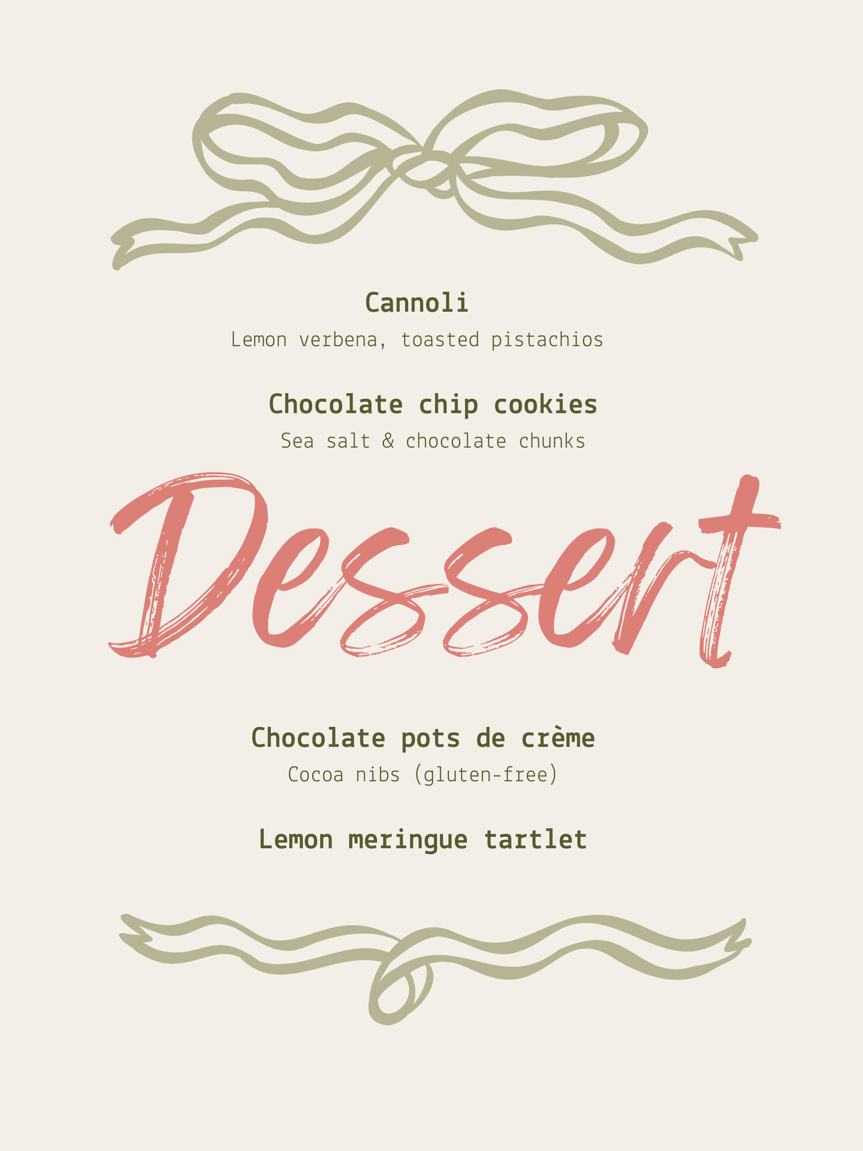 For their wedding reception, M & T requested menus for each guest’s plate, cocktail bar, and dessert table. We also made table signs for shuttle service, guest book, and photos.